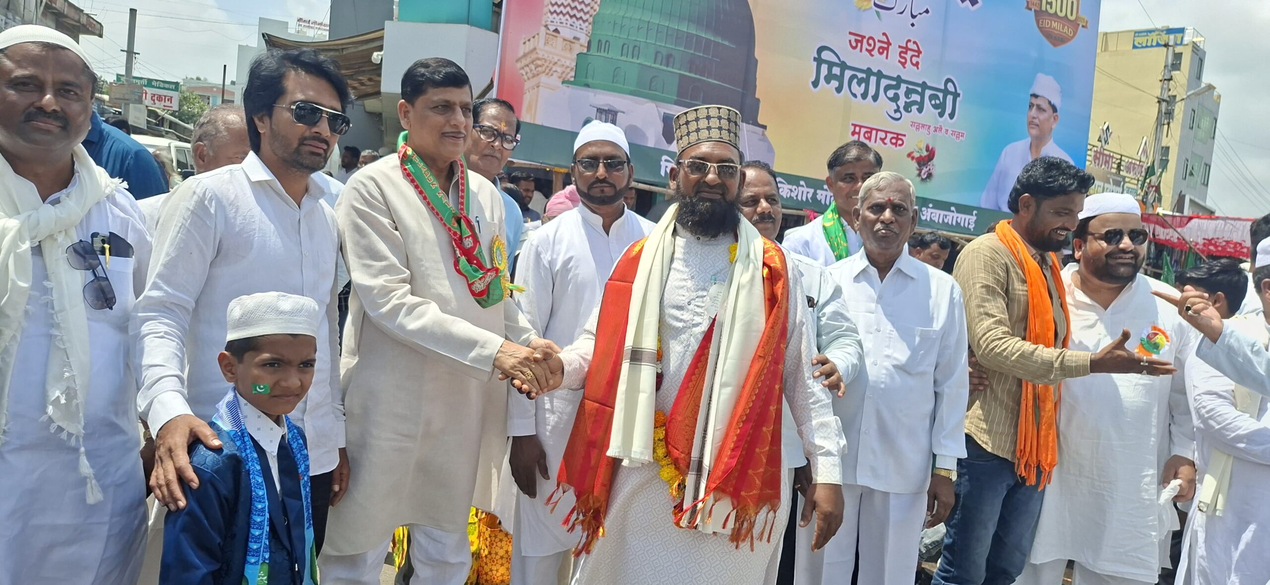 या जुलूसमध्ये सहभागी झालेल्या सर्व मुस्लिम बांधवांचे अंबाजोगाई शहराचे माजी नगराध्यक्ष राजकिशोर मोदी यांनी आपल्या सहकाऱ्यांसोबत मिठाई वाटून जोरदार स्वागत केले. जुलूसमध्ये मिठाई देत राजकिशोर मोदी व मित्र मंडळाने हिंदू मुस्लिम एकोप्याचे दर्शन घडविले. यावेळी जुलूस मध्ये मोदी यांच्या सोबत बबन लोमटे, शहराध्यक्ष महादेव आदमाणे, धम्मा सरवदे उपाध्यक्ष सय्यद रशीद, खालेद चाऊस, डॉ राजेश इंगोले, पंडित हुलगुंडे, किशोर परदेशी, विजय रापतवार , अंकुश हेडे, सुभाष पाणकोळी,भिमसेन लोमटे, अशोक जेधे, गणेश मसने, शाकेर काझी, जावेद गवळी, सुशील वाघमारे, अकबर पठाण, खलील जाफरी, कैलास कांबळे, दत्ता सरवदे, आकाश कऱ्हाड, विशाल पोटभरे , उज्जेन बनसोडे, शेख अस्लम, रोशन लाड यांच्यासह अनेक सहकारी उपस्थित होते.
