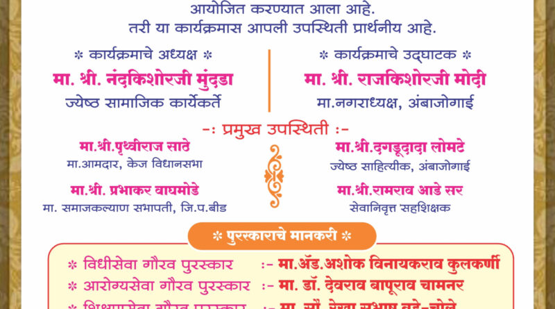 Read Moreतात्या-आभई आदर्श प्रतिष्ठान अंबाजोगाई चे सेवा गौरव पुरस्कार जाहीर अंबाजोगाई (प्रतिनिधी)– अंबाजोगाई येथील तात्या-आभई आदर्श प्रतिष्ठान अंबाजोगाई च्या वतीने